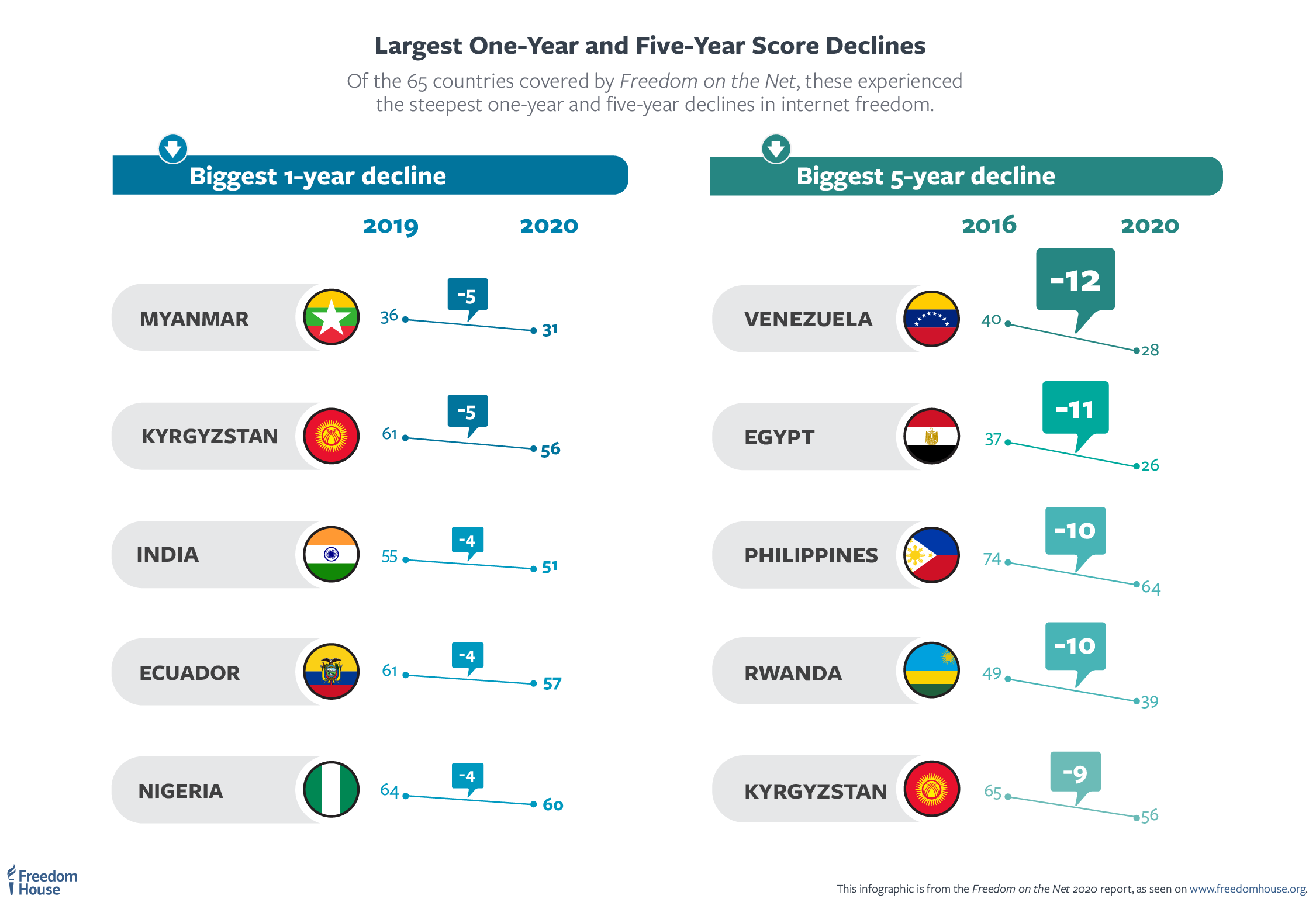 What were initially isolated events progressively became a systematic policy of internet censorship. In 2017, Venezuela was, for the first time, classified as a “not free” country in Freedom House's Freedom on the Net report, becoming the second country in the region to be so designated, along with Cuba. And, in the 2020 edition of the report, Venezuela appears as the country with the largest drop in the ranking scores during the previous five years.